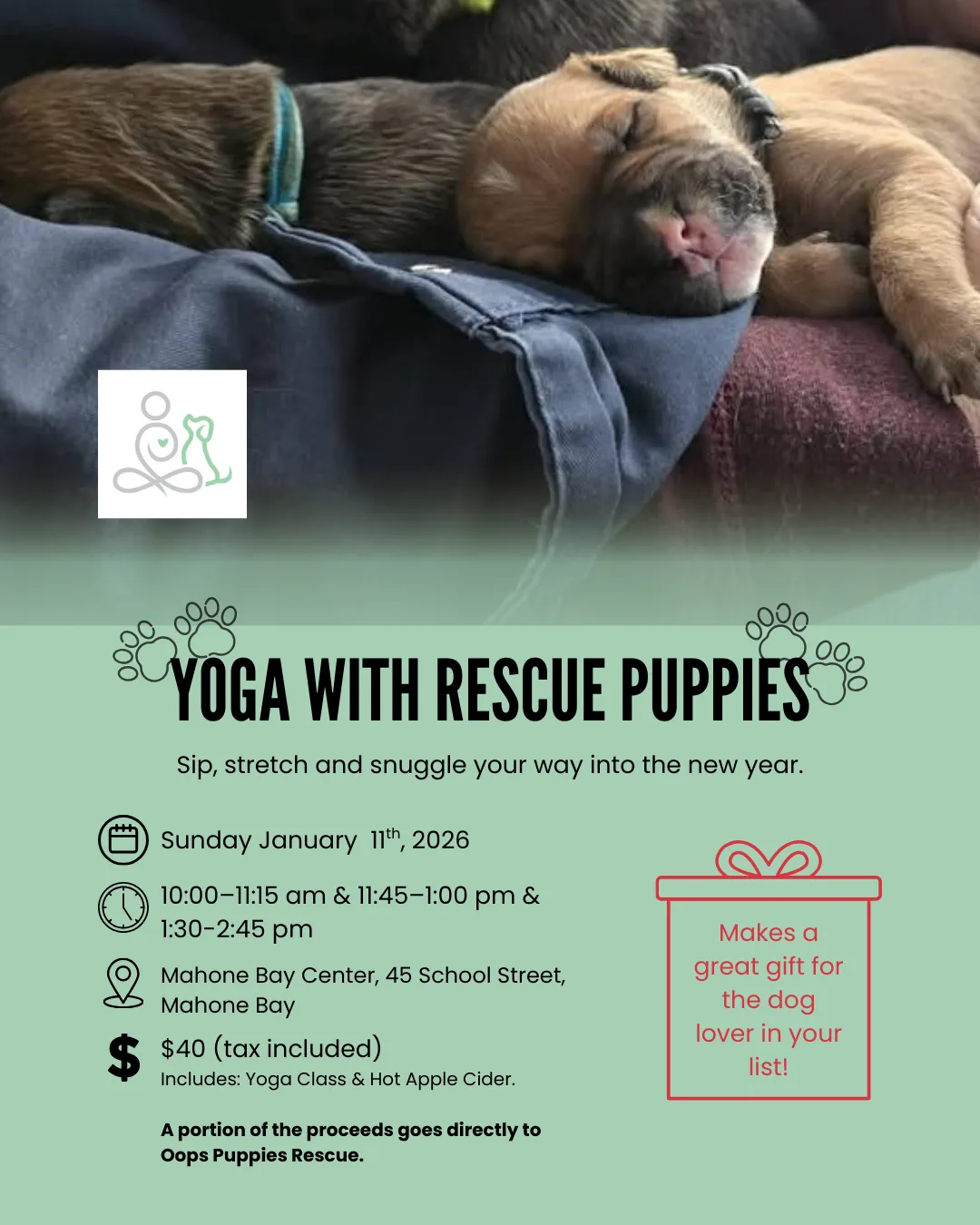 Join us for a heart opening and laughter filled Yoga with Rescue Puppies experience in Mahone Bay. This unique event which was created by Miranda Wimbush of The Mindful Canine and will be taught by Rhonda Lemire of Yoga with Rhonda blends gentle movement, mindful presence, and plenty of puppy snuggles in support of Oops Puppies Rescue.